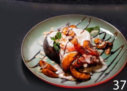 малиновое варенье, сметана, мята, сахарная пудра, чёрная смородина, миндальные лепестки