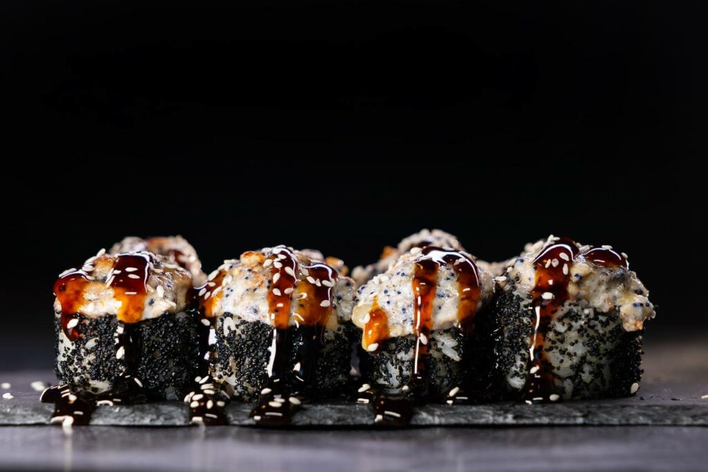 темпура краб, рис, краб, сыр сливочный, огурец, нори, кунжут, соус унаги, соус спайси, темпура