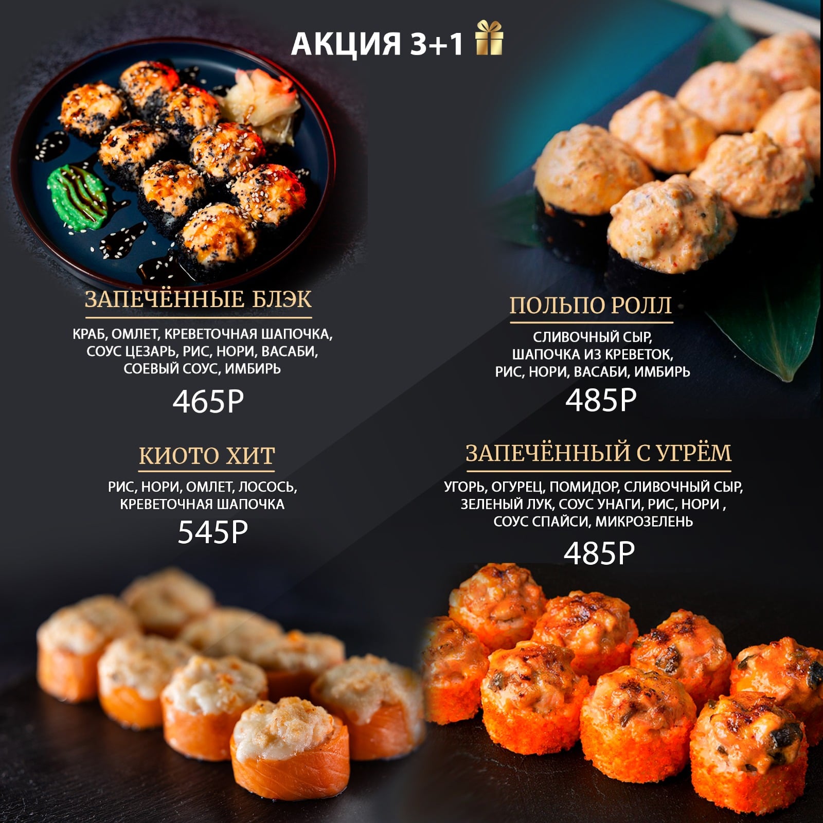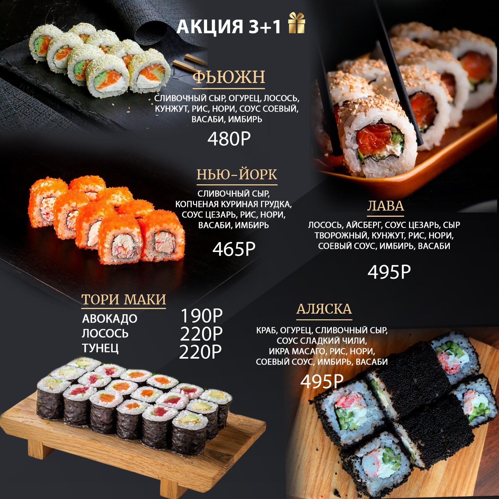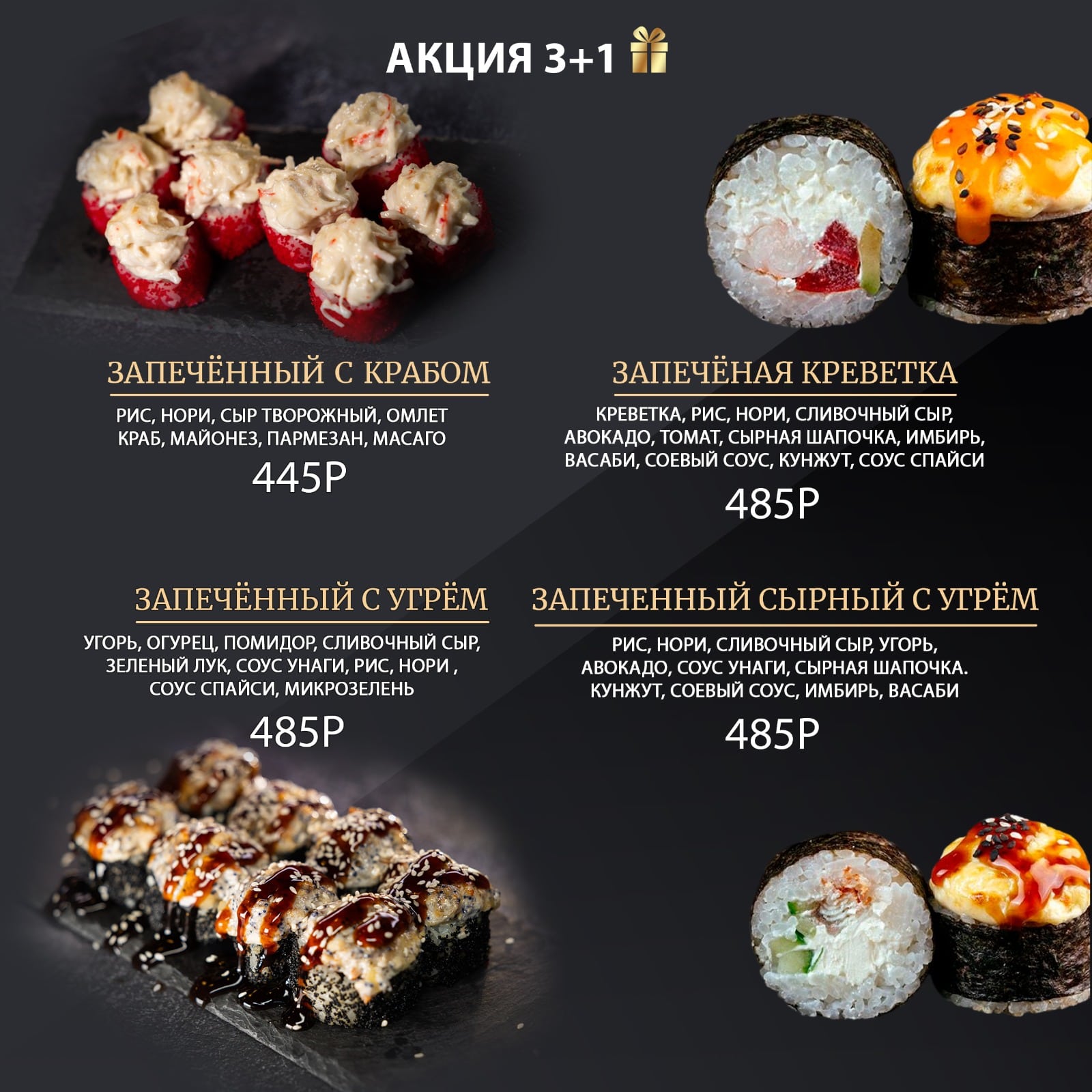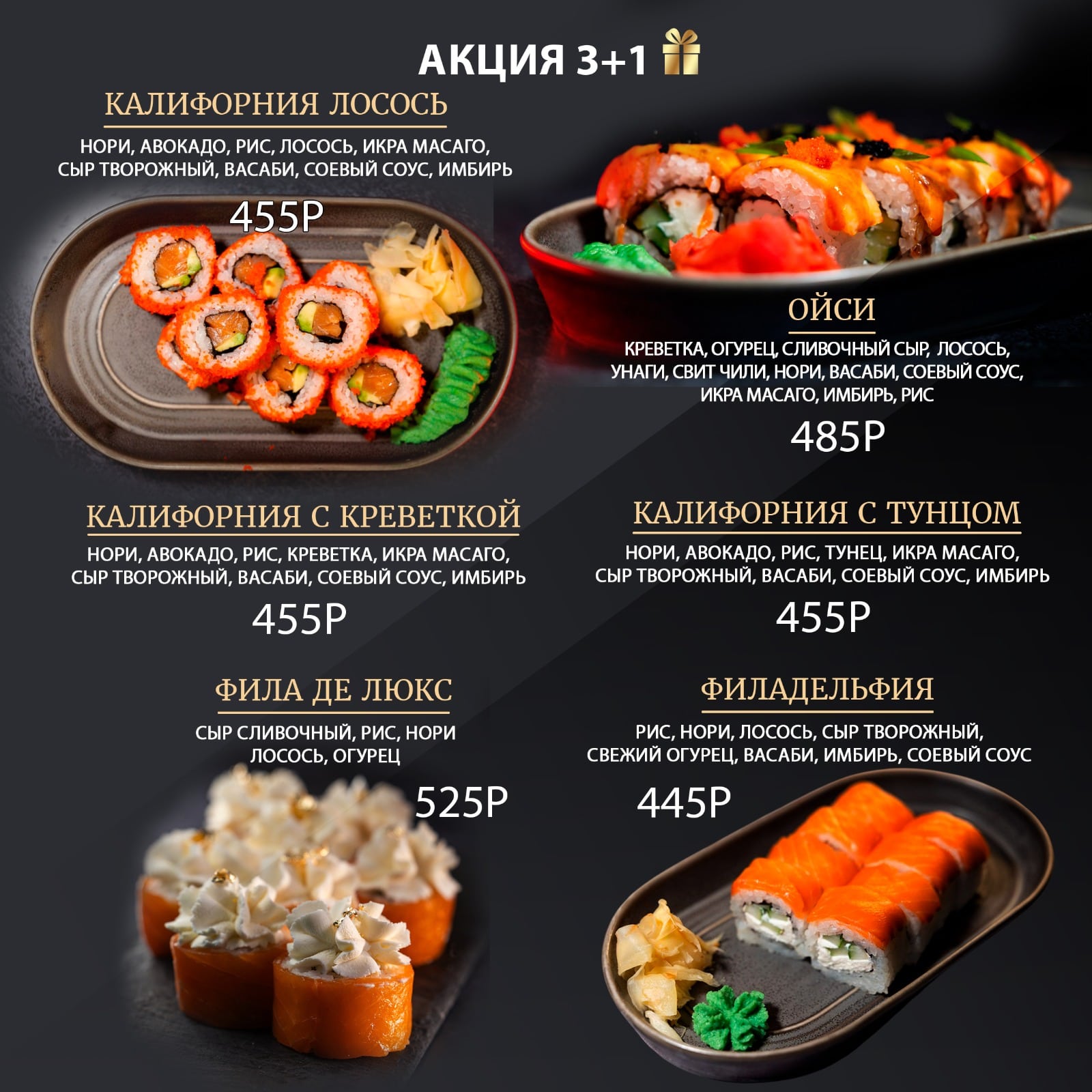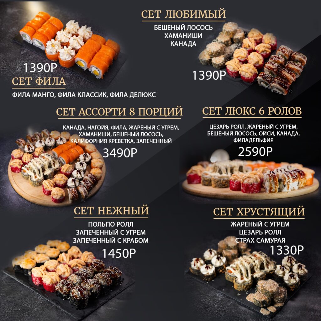 запеченный с тунцом и персиками, бешеный лосось запеченный, калифорния креветка, фила классик, калифорния блек, люкс бонито