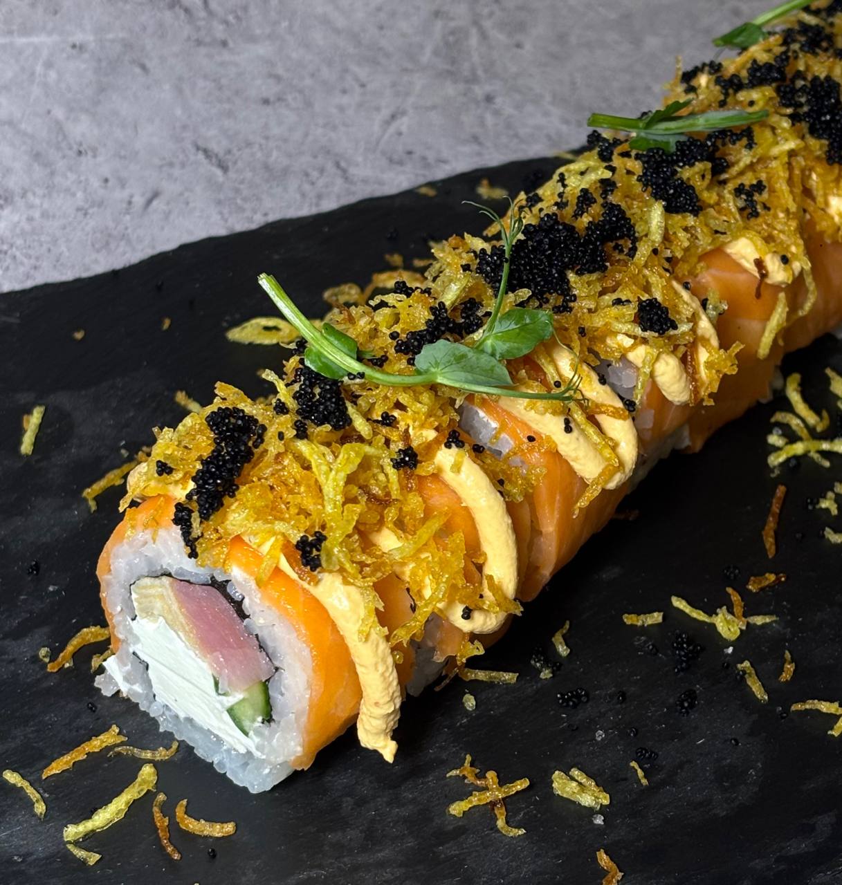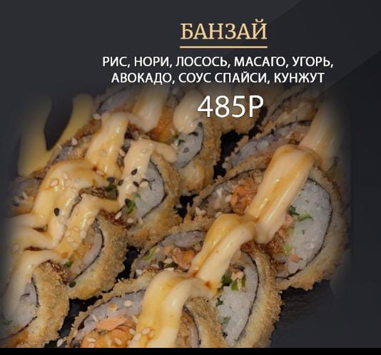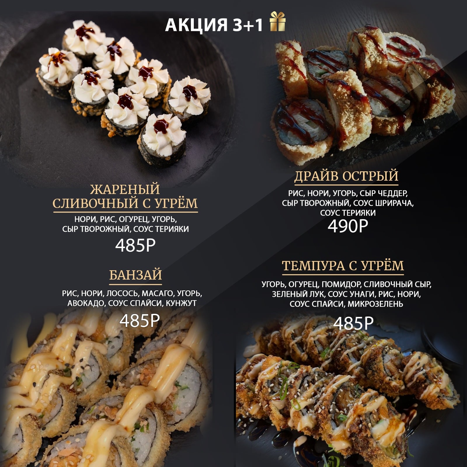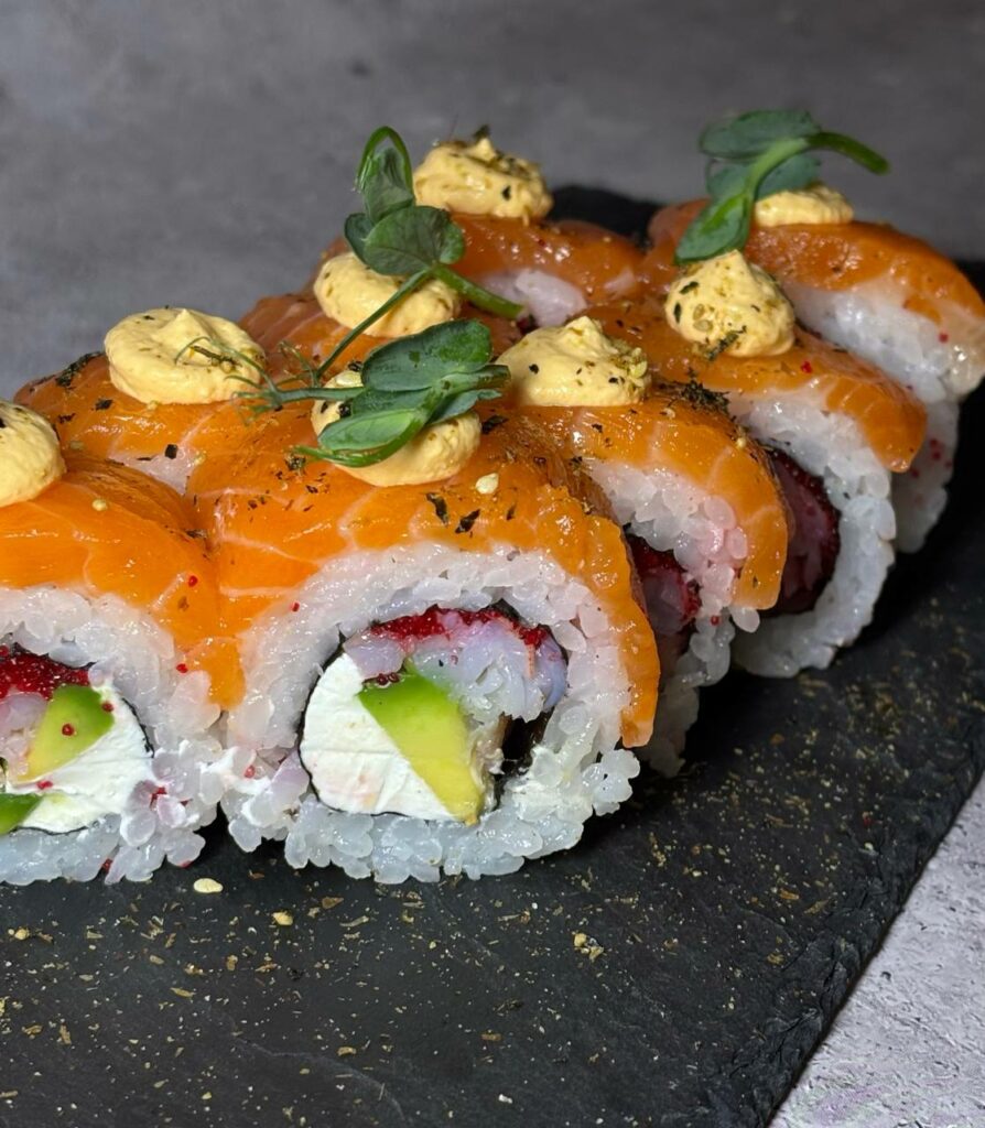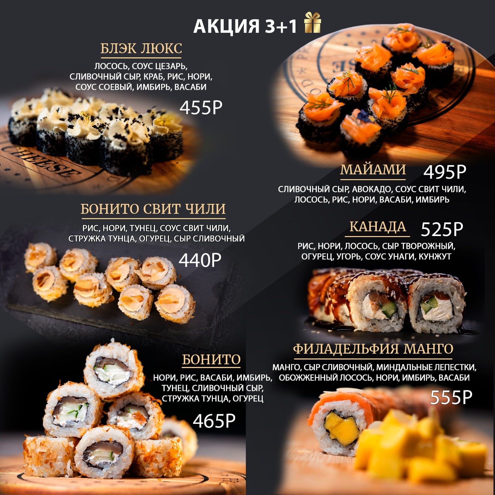 запеченный с тунцом и персиками, бешеный лосось запеченный, калифорния креветка, фила классик, калифорния блек, люкс бонито