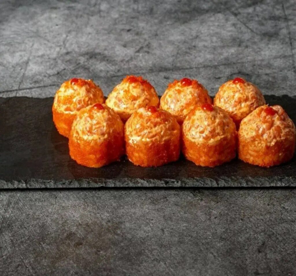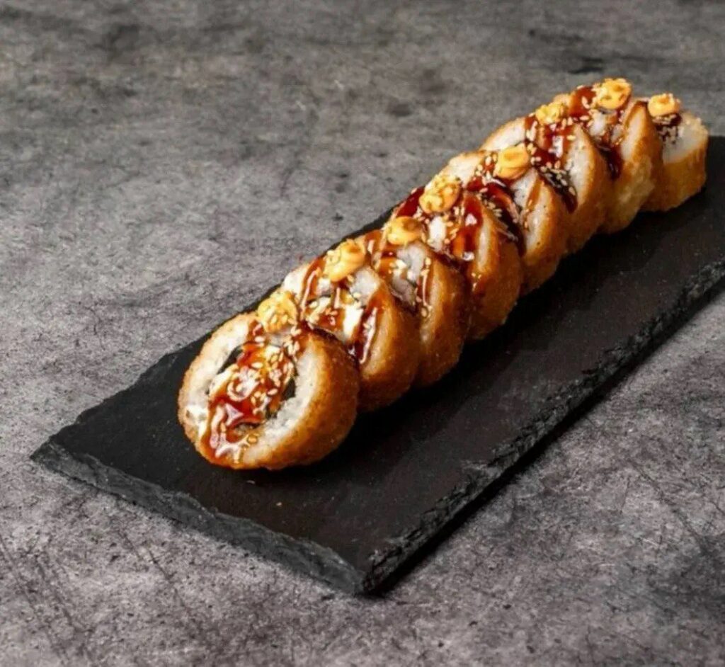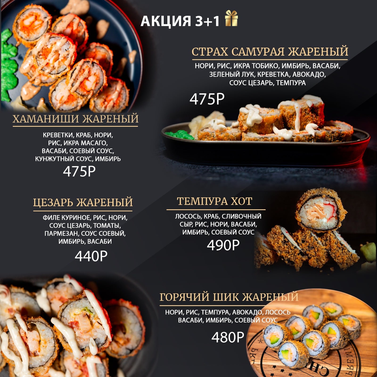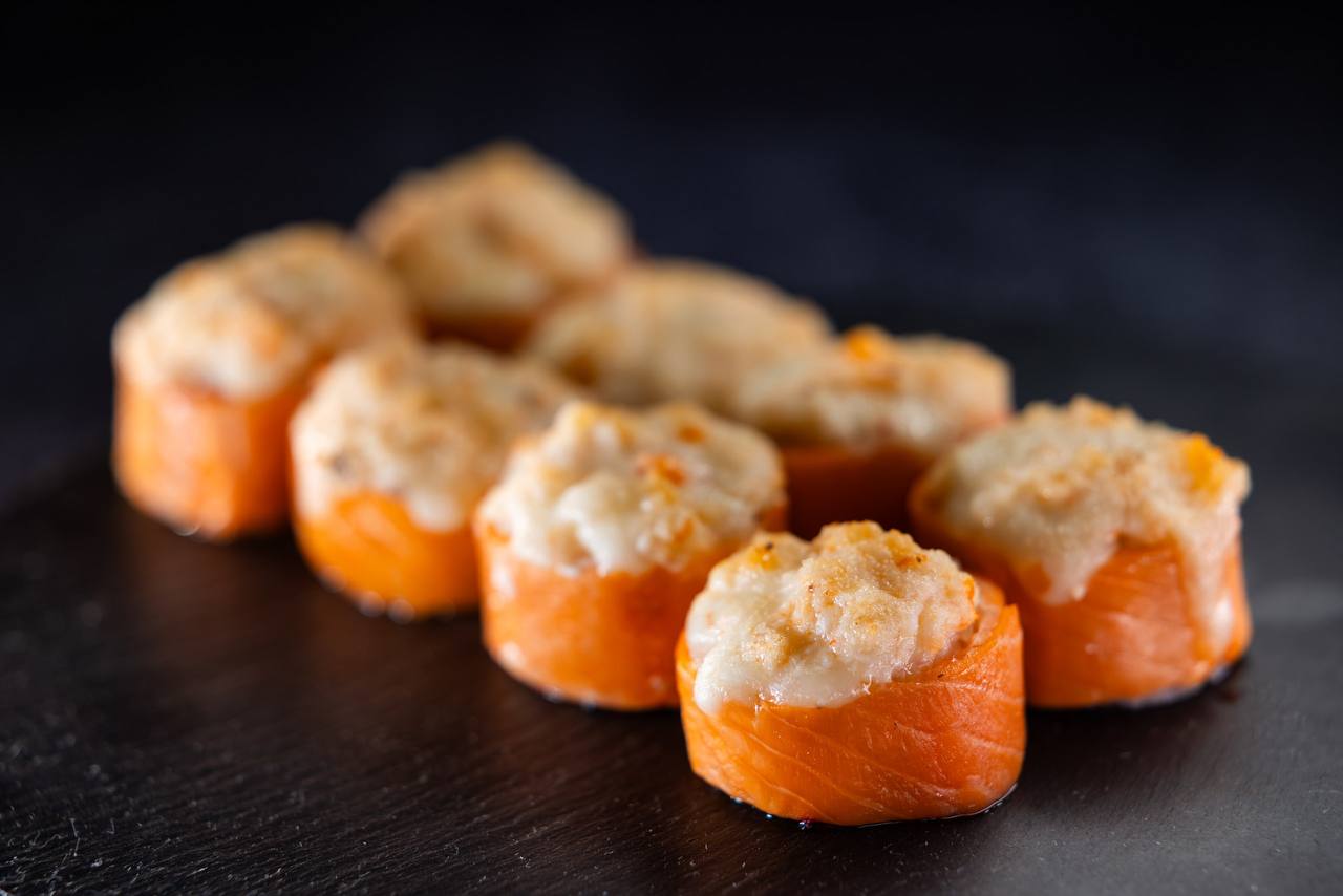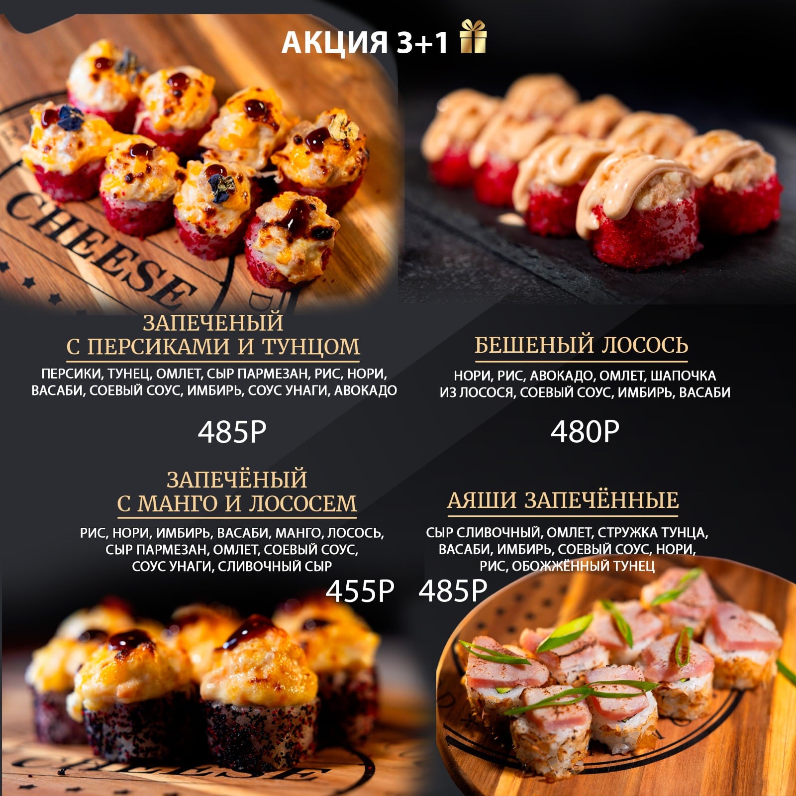 запеченный с тунцом и персиками, запеченный с манго и лососем, филадельфия классик, горячее фило, манго жареный, хамакаши горячий, шик калифорния, цезарь ролл