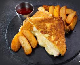 подается с картофелем по деревенски и кетчупом хайрис, сырный соус, сыр моцарелла, сыр российский, яйцо, картофельные дольки, кетчуп