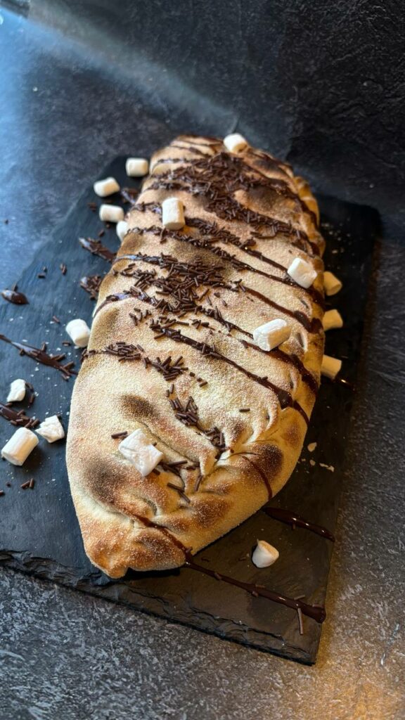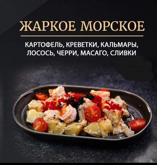тесто, соус сливочный, моцарелла, креветки, мидии, кальмары, соус унаги, соус свит чили, икра масаго, лук зелёный