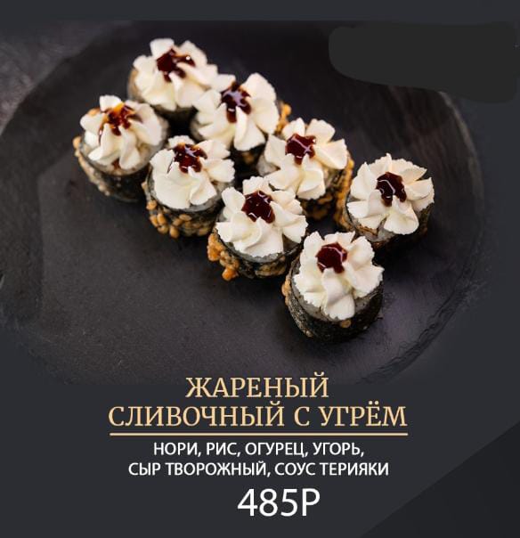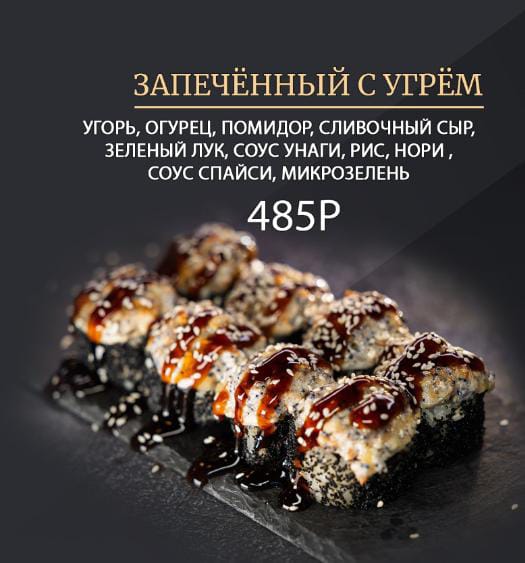 угорь, огурец, помидор, сливочный сыр, зеленый лук, соус унаги, рис, нори, соус спайси, микрозелень