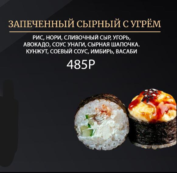 рис, нори, сливочный сыр, угорь, авокадо, соус унаги, сырная шапочка, кунжут, соевый соус, имбирь, васаби