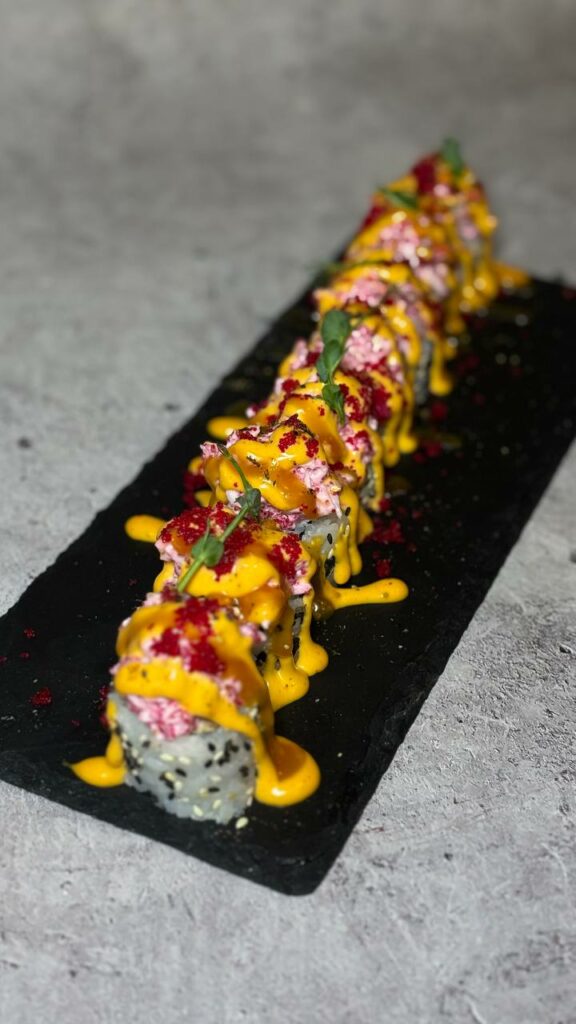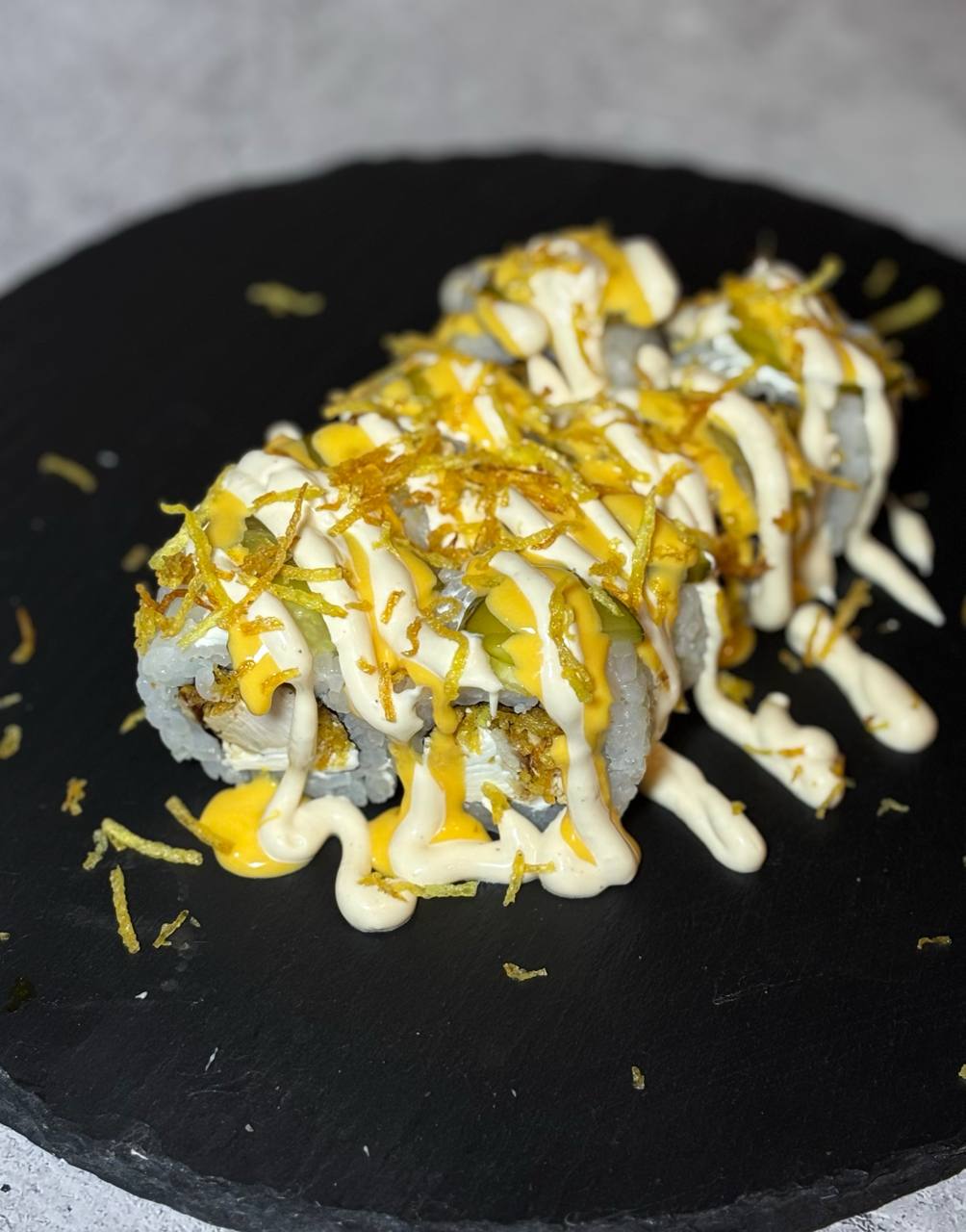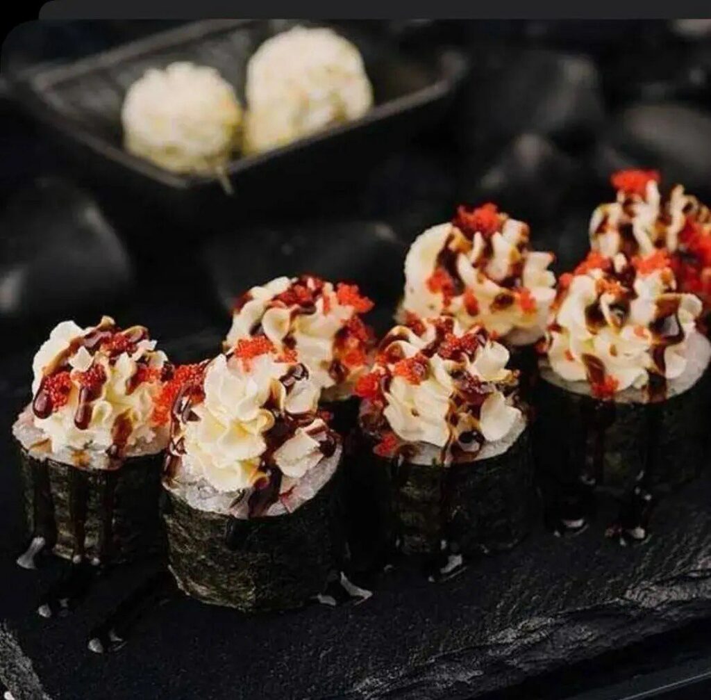 рис, нори, краб, соус спайси, майонез, масаго, кунжут, омлет, сыр творожный, унаги, приправа фирменная, имбирь, васаби, соевый соус карамельный соус