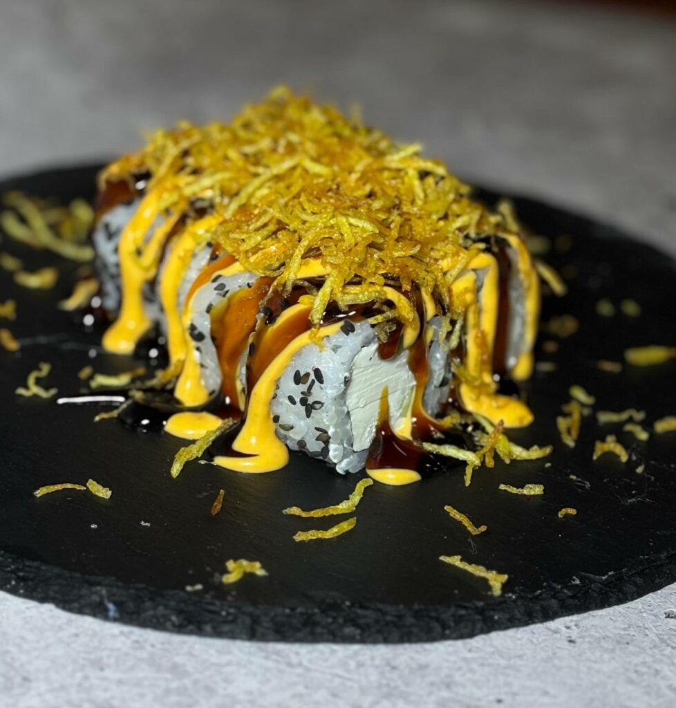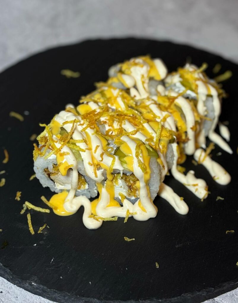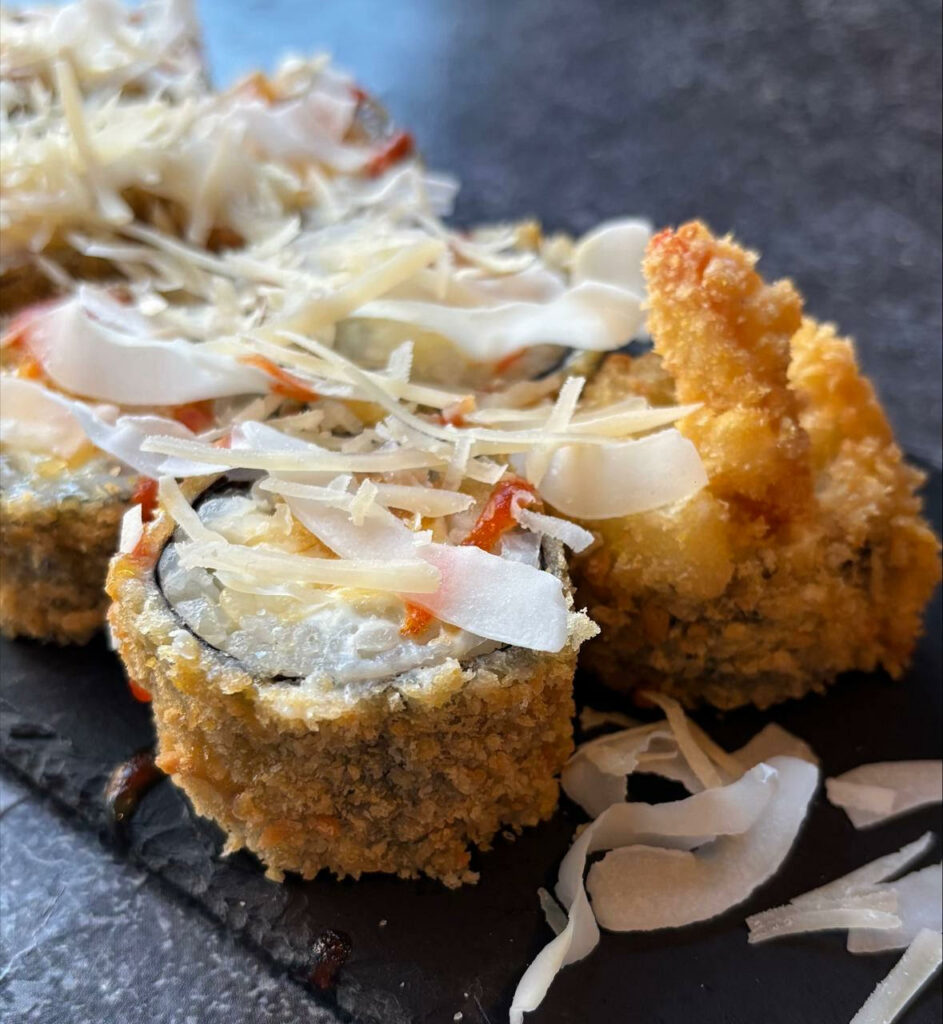 Рис Нори, креветка темпура, соус шрирача, сыр пармезан, сыр творожный, кокосовые чипсы
