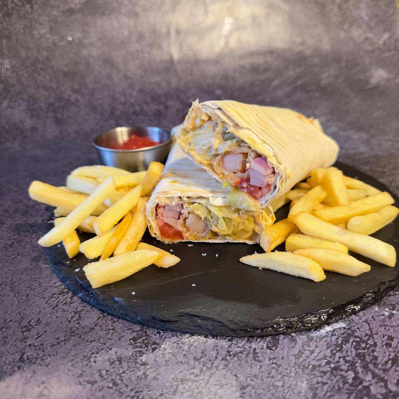 Лаваш, соус фирменый, креветки темпура, айсберг томаты
