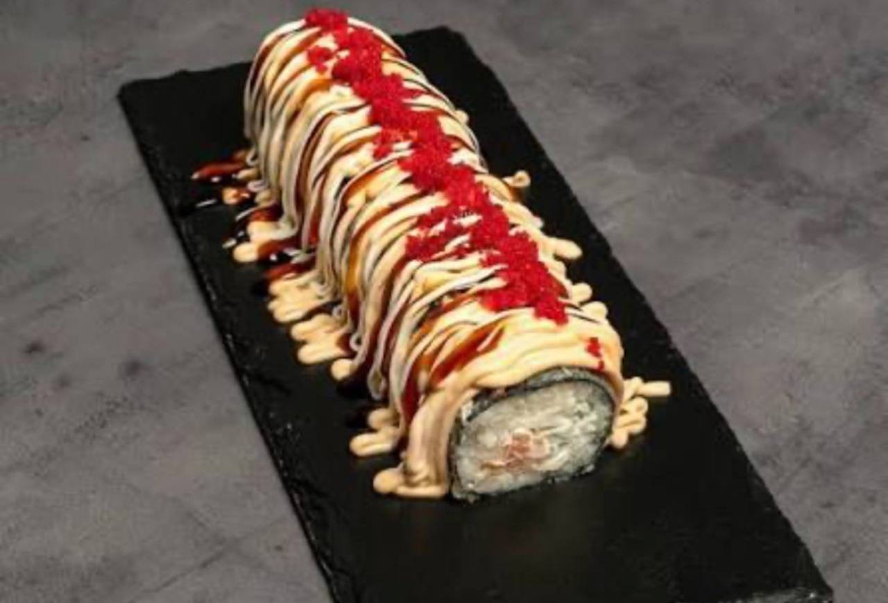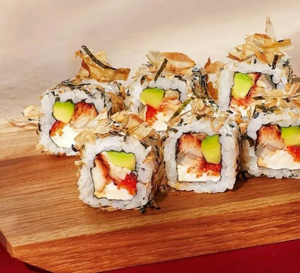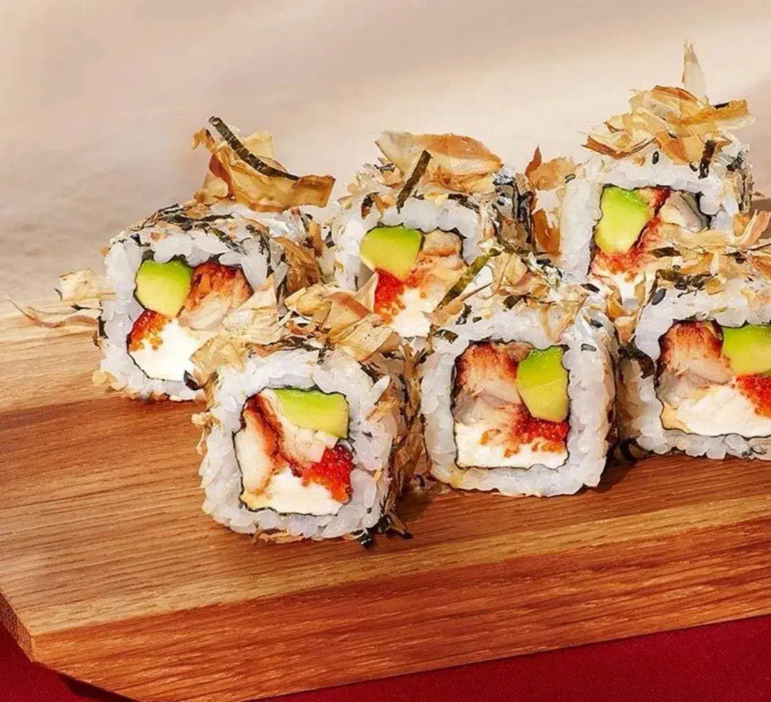 жареный угорь,авокадо, сливочный сыр, масаго, кунжут, стружка тунца, соус спайси