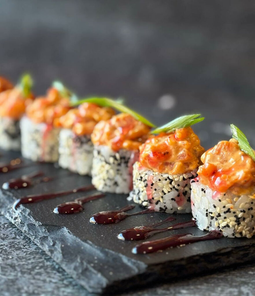 рис, нори, лосось, сыр творожный, спайси соус, масаго, кунжут, лосось тартар, авокадо, приправа фирменная, васаби, соевый соус, зеленый лук, брусничный соус, имбирь