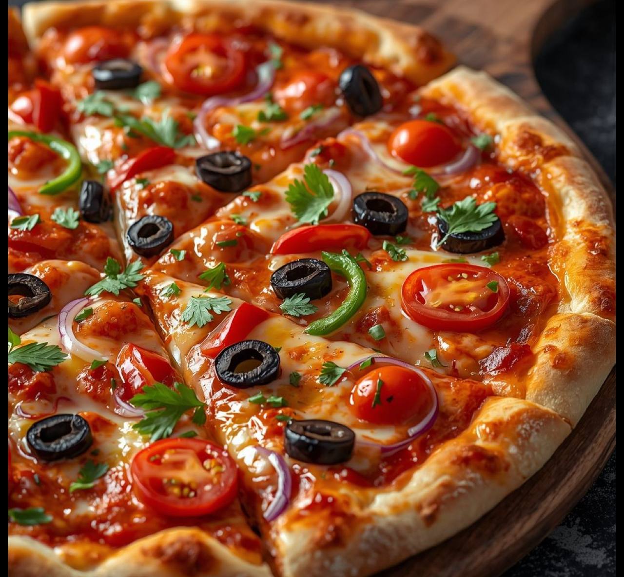 Томаты перец болгарский кабачок грибы маслины красный лук сыр моцарелла зеленый лук соус красный