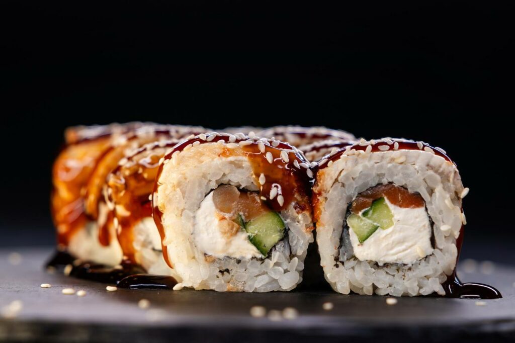 рис, нори,огурец, угорь, креветка, сыр творожный, соус унаги, икра масаго, лук зеленый